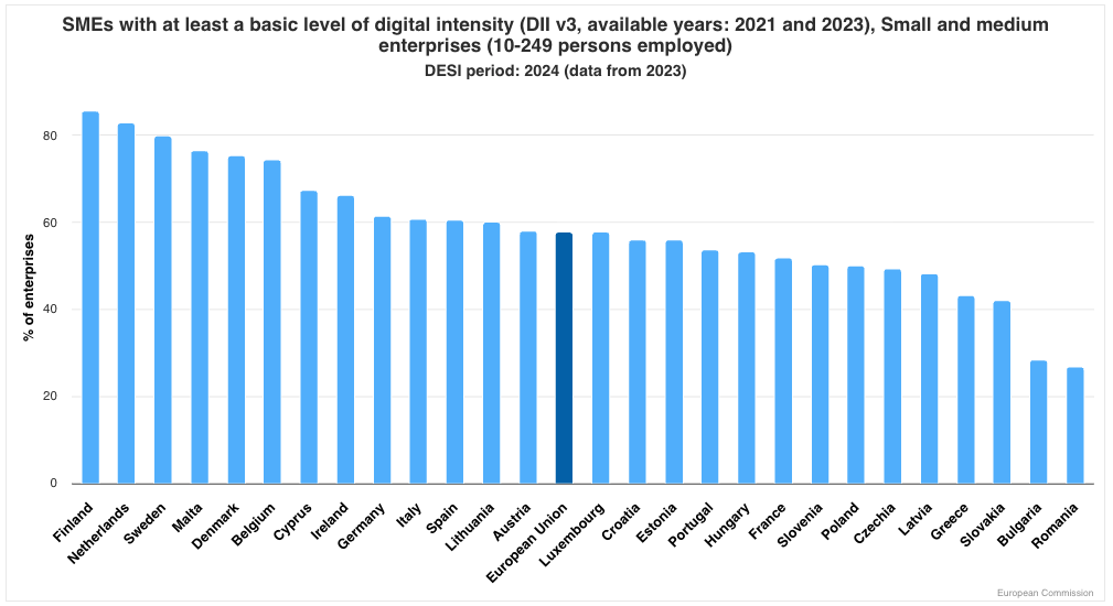 Finnland, die Niederlande und Schweden liegen mit über 80 % an der Spitze der kleinen und mittleren Unternehmen. Der EU-Durchschnitt beträgt rund 60 %. Österreich liegt im Mittelfeld. Die niedrigsten Werte zeigen Bulgarien und Rumänien mit unter 30 %. Quelle: DESI, abgerufen am 6.11.2025