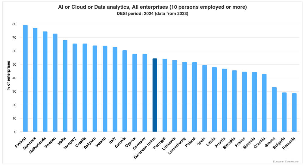 Finnland liegt mit knapp 80 % klar vorne, gefolgt von Dänemark und den Niederlanden. Der EU-Durchschnitt beträgt rund 55 %. Österreich befindet sich im unteren Mittelfeld. Bulgarien, Griechenland und Rumänien bilden mit unter 35 % das Schlussfeld. Quelle: DESI, abgerufen am 6.11.2025
