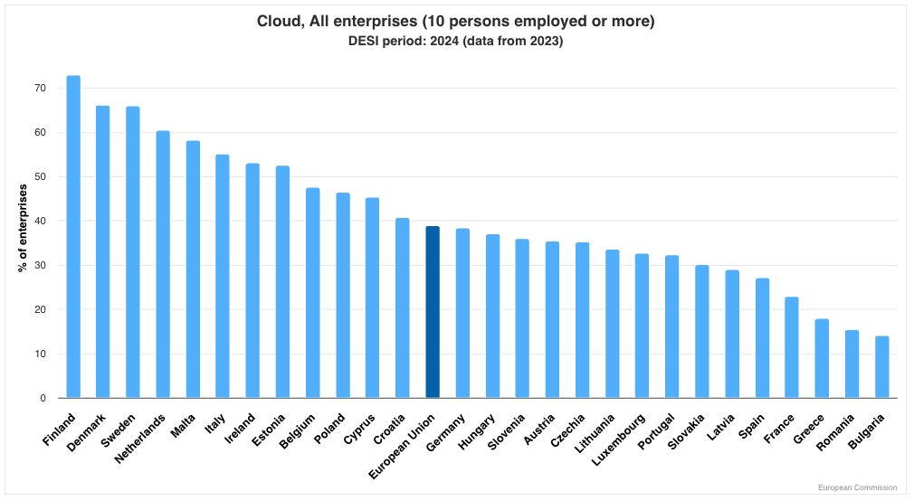 Finnland führt mit über 70 %, gefolgt von Dänemark und Schweden. Der EU-Durchschnitt liegt bei rund 42 %. Österreich befindet sich im Mittelfeld. Frankreich, Griechenland, Rumänien und Bulgarien liegen mit unter 25 % am unteren Ende. Quelle: DESI, abgerufen am 6.11.2025