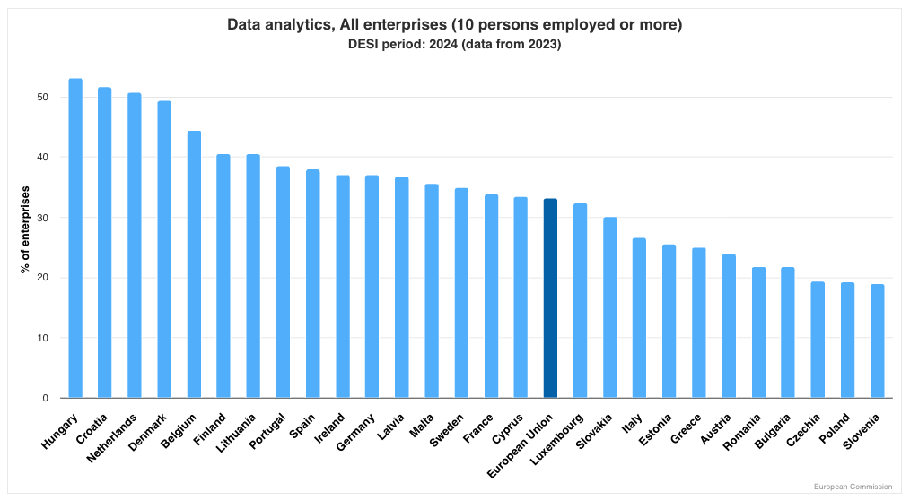 Ungarn, Kroatien und die Niederlande liegen mit über 50 % an der Spitze. Der EU-Durchschnitt liegt bei rund 33 %. Österreich liegt im unteren Mittelfeld. Slowenien und Polen bilden das Schlussfeld mit unter 20 %. Quelle: DESI, abgerufen am 6.11.2025